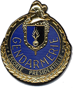 Description héraldique: Rondache d'azur à la bordure d'or chargée d'un sycamor denté du même à l'orle de sable, timbrée d'un écusson aux couleurs et symboles de la gendarmerie nationale accompagné du nom "GENDARMERIE" en capitale d'or surmontant un cartouche de sable à l'inscription "ESCORTE PRESIDENTIELLE" en capitales d'or accompagnée de deux étoiles du même, le tout soutenu par deux branches de laurier du premier métal |