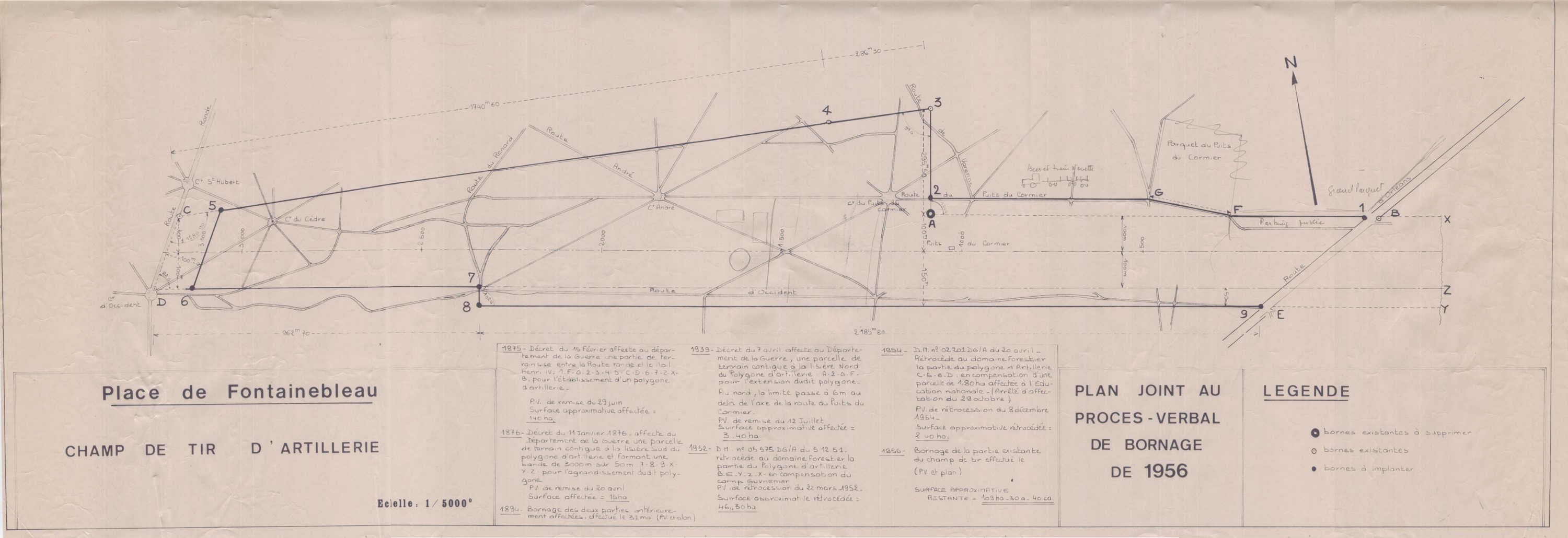 1956 : bornage de la partie existante du champ de tir effectué le ?. (PV et plan). Surface approximative restante : 109 ha, 30 a, 40 ca.